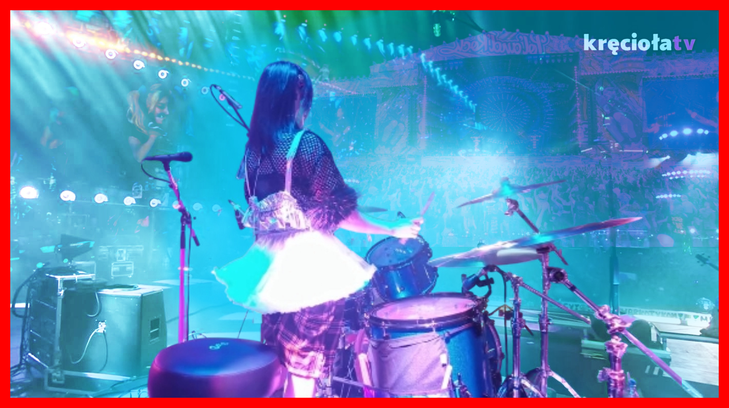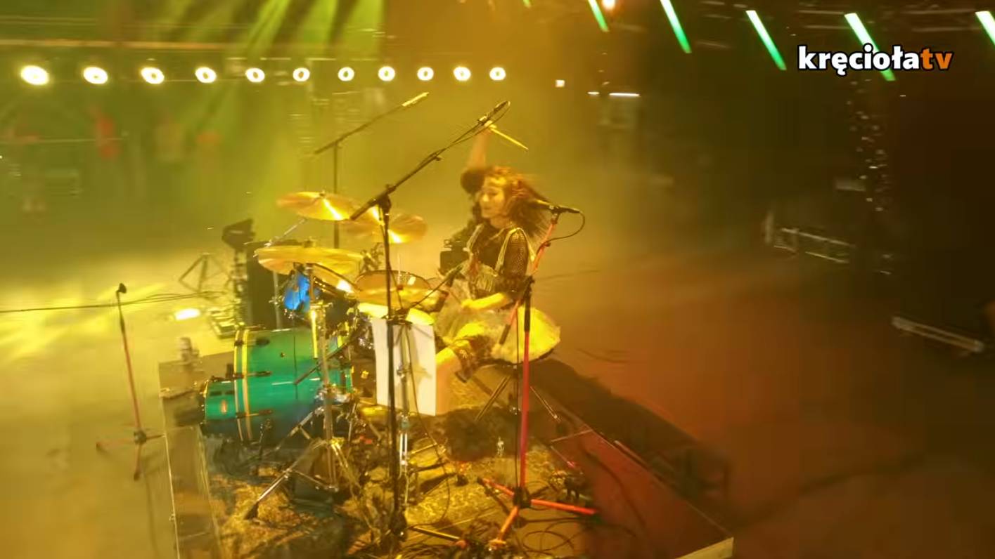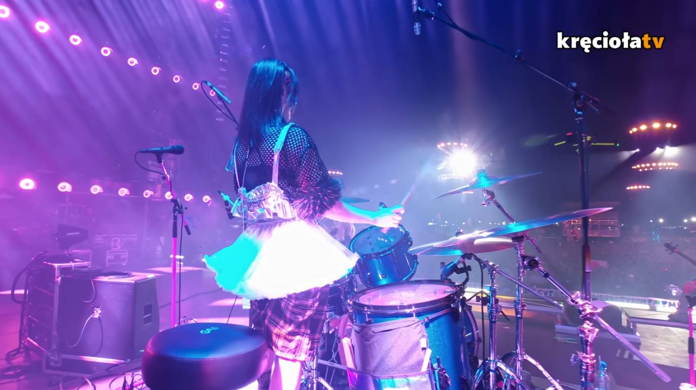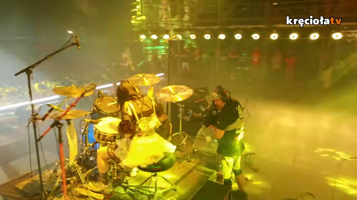 So my message to music festivals in general is: We don't want to see steel bars and heavy cable boxes, we want to see cool things, and we want to see the band! And please don't push the drummer into a tight corner or right at the back wall! At Pol'and'Rock, the drummer has their righteously earned place in the middle of the stage, free from distractions, cables, walls and boxes. The filmed shots of the drummer look good, and it makes the drummer look cool and important, and not just an afterthought that had to be compromised into whatever place on the stage was left for that big drum kit. It helps that the Pol'and'Rock stage is very wide and very deep, and the high ceiling height also adds to the look of the drummer and makes every filmed frame of the stage look composed: